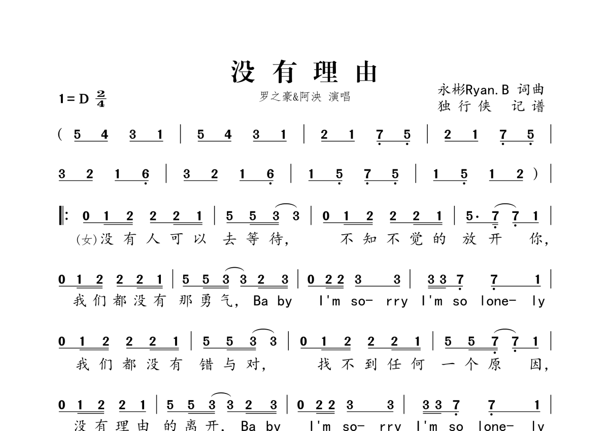 《没有理由》是罗之豪、阿泱演唱的一首歌曲,拍号为2/4拍,这份简谱共有两张高清图谱,图谱由 @独行侠 编配上传。