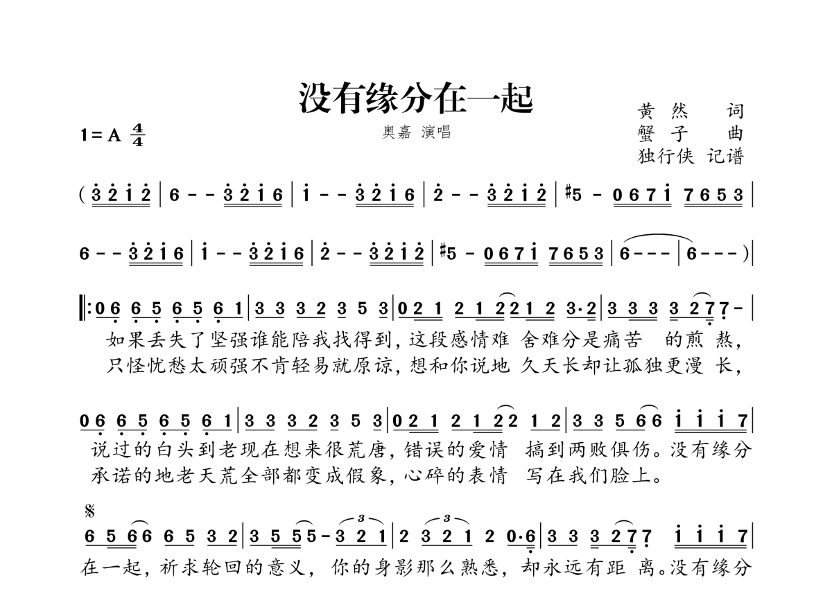 《没有缘分在一起》是奥嘉演唱的一首歌曲,拍号为4/4拍,这份简谱共有一张高清图谱,图谱由 @独行侠 编配上传。