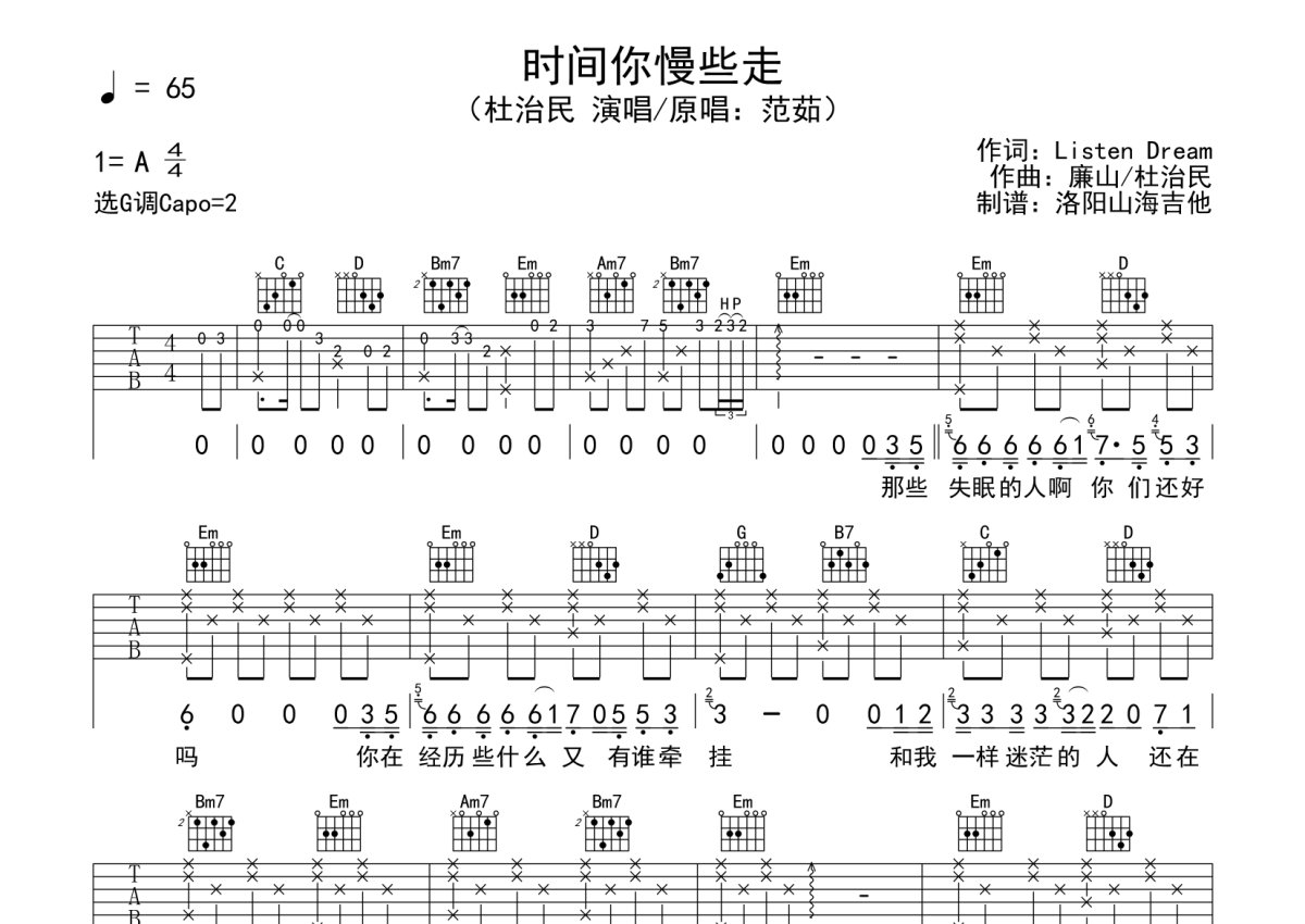 杜治民《时间你慢些走》吉他谱 - G调弹唱六线谱
