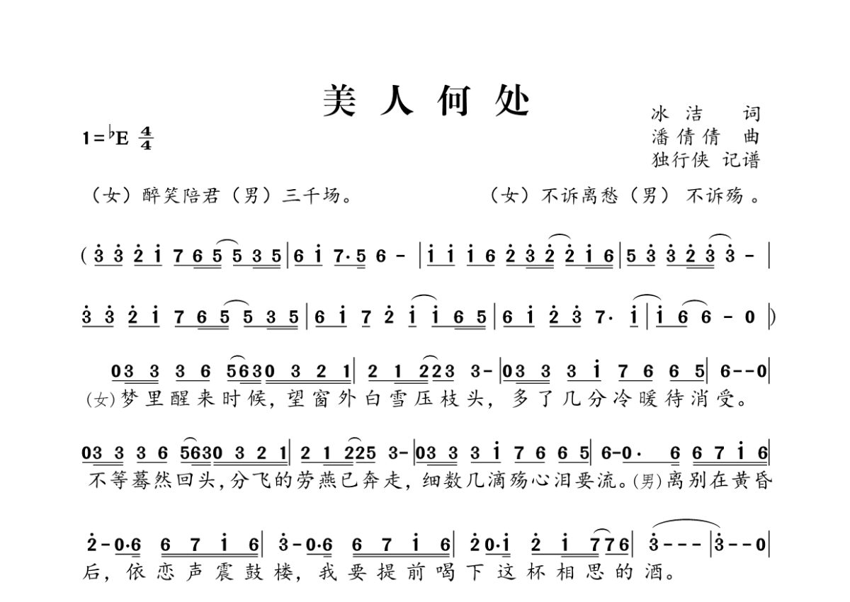 《美人何处》,拍号为4/4拍,这份简谱共有一张高清图谱,图谱由 @独行侠 编配上传。