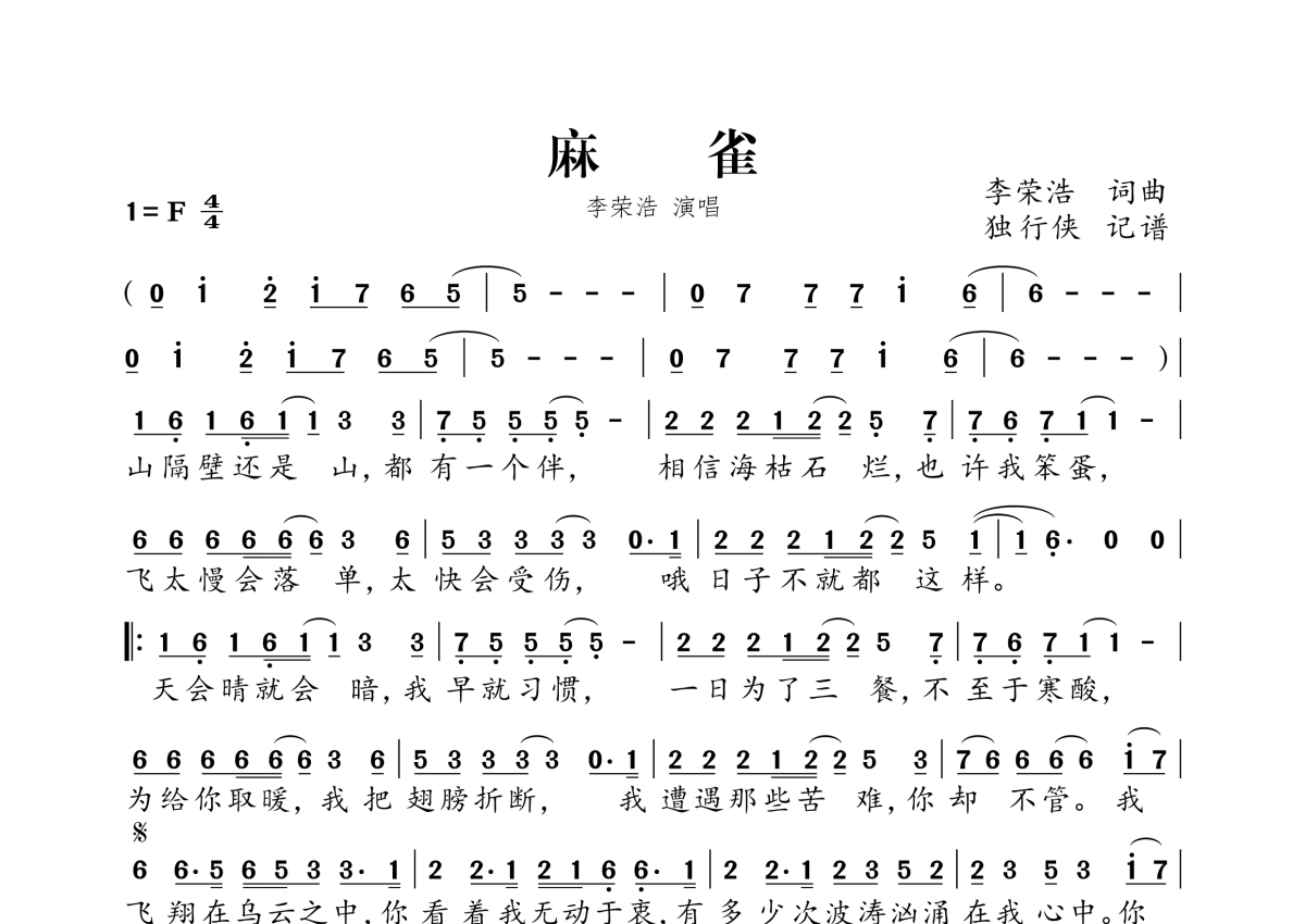 《麻雀》是李荣浩演唱的一首歌曲,拍号为4/4拍,这份简谱共有一张高清图谱,图谱由 @独行侠 编配上传。