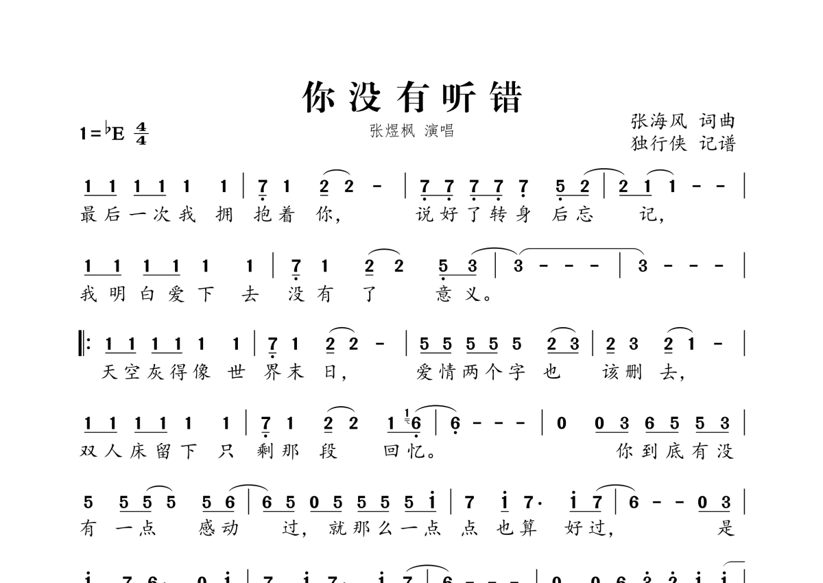 《你没有听错》是张煜枫演唱的一首歌曲,拍号为4/4拍,这份简谱共有一张高清图谱,图谱由 @独行侠 编配上传。