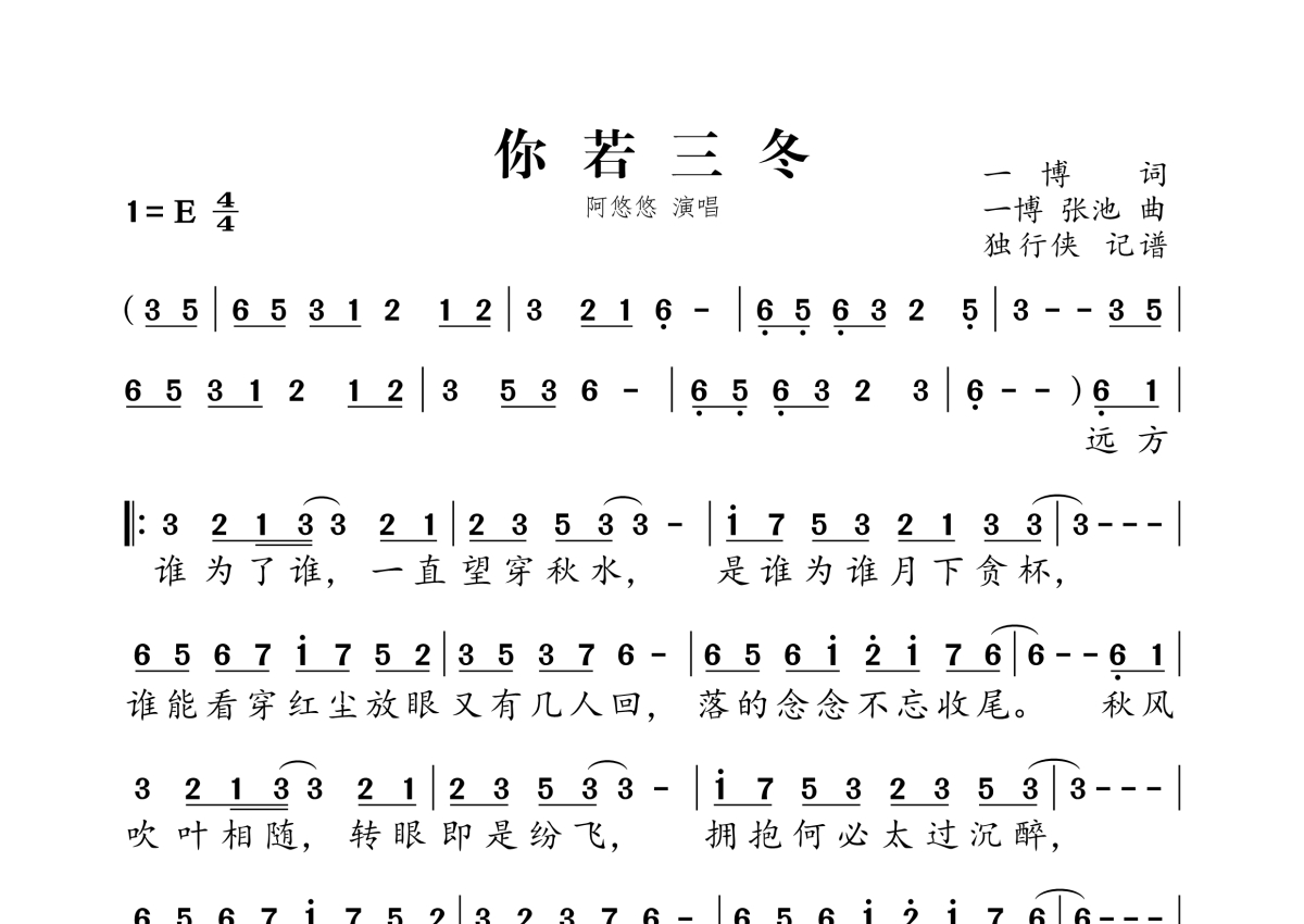 《你若三冬》是阿悠悠演唱的一首歌曲,拍号为4/4拍,这份简谱共有两张高清图谱,图谱由 @独行侠 编配上传。