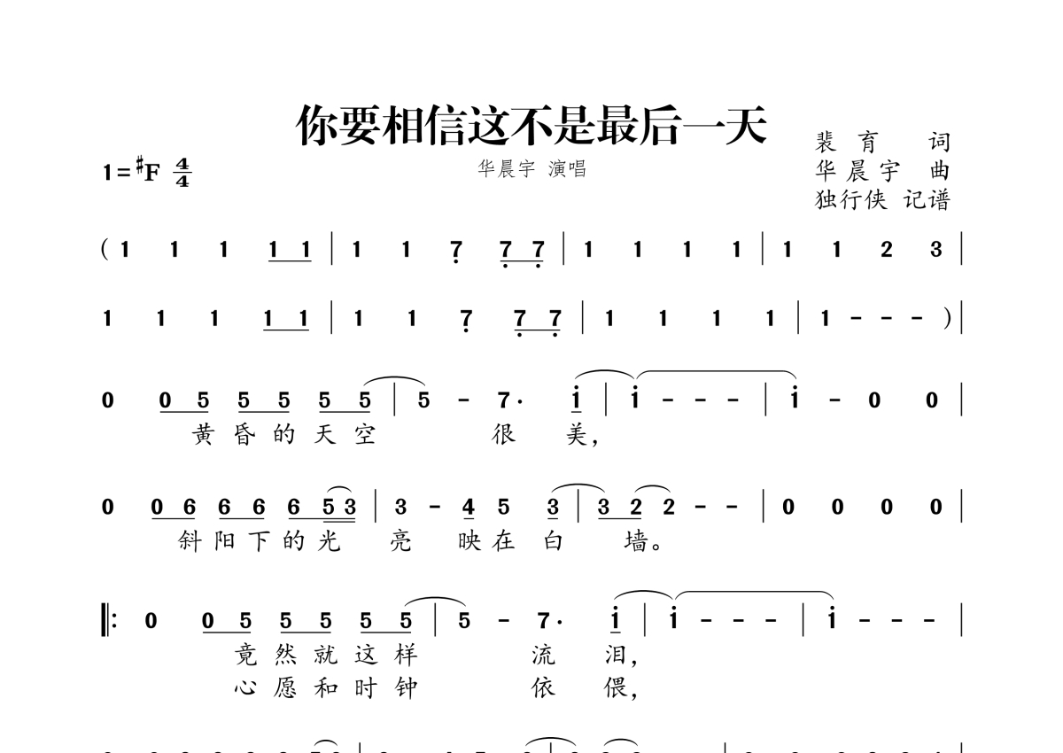 《你要相信这不是最后一天》是华晨宇演唱的一首歌曲,拍号为4/4拍,这份简谱共有两张高清图谱,图谱由 @独行侠 编配上传。