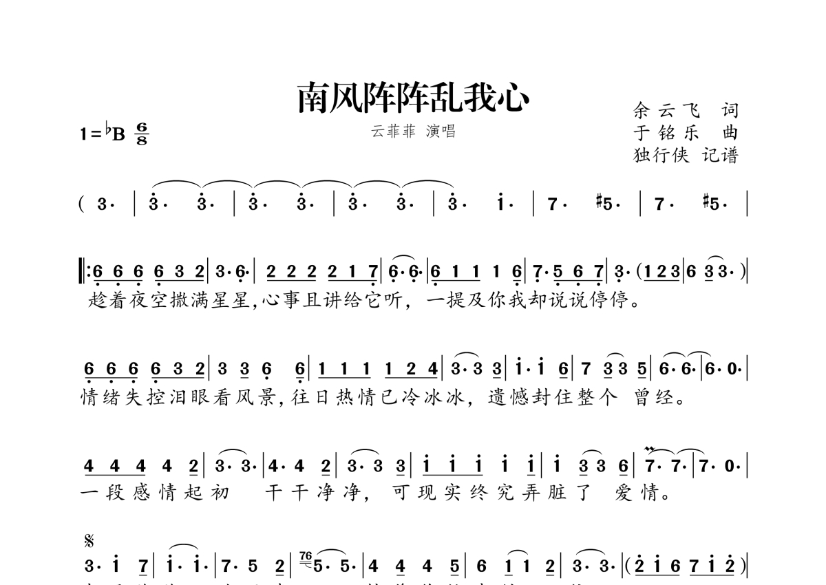 《南风阵阵乱我心》是云菲菲演唱的一首歌曲,拍号为6/8拍,这份简谱共有一张高清图谱,图谱由 @独行侠 编配上传。
