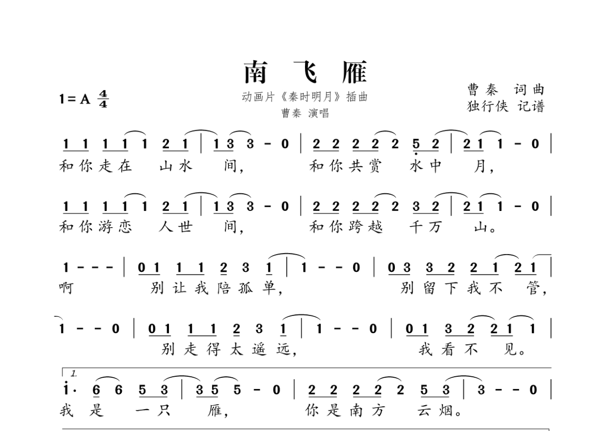 《南飞雁》是曹秦演唱的一首歌曲,拍号为4/4拍,这份简谱共有一张高清图谱,图谱由 @独行侠 编配上传。