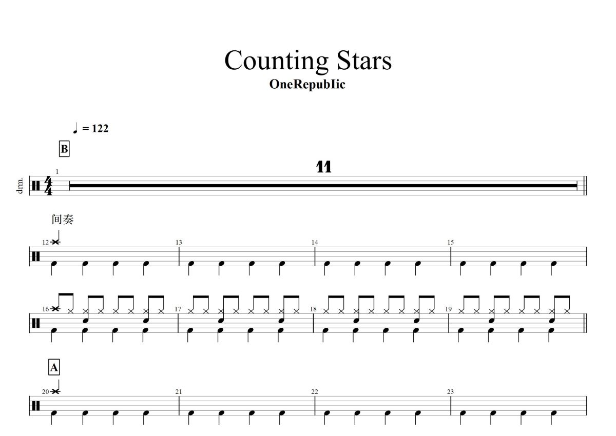 《Counting Stars 》是OneRepubIic演唱的一首歌曲,这份鼓谱共有三张高清图谱,图谱由 @打鼓谱 编配上传,图谱使用五线谱编配,使用这份Counting Stars 架子鼓谱,你将能够轻松地敲打出这首OneRepubIic的Counting Stars ,快来尝试吧。《Counting Stars》是美国流行摇滚乐队共和时代演唱的一首歌曲,词曲由瑞恩·泰德个人谱写。歌曲收录在共和时代第三张录音室专辑《Native》,为该专辑的第三支单曲。