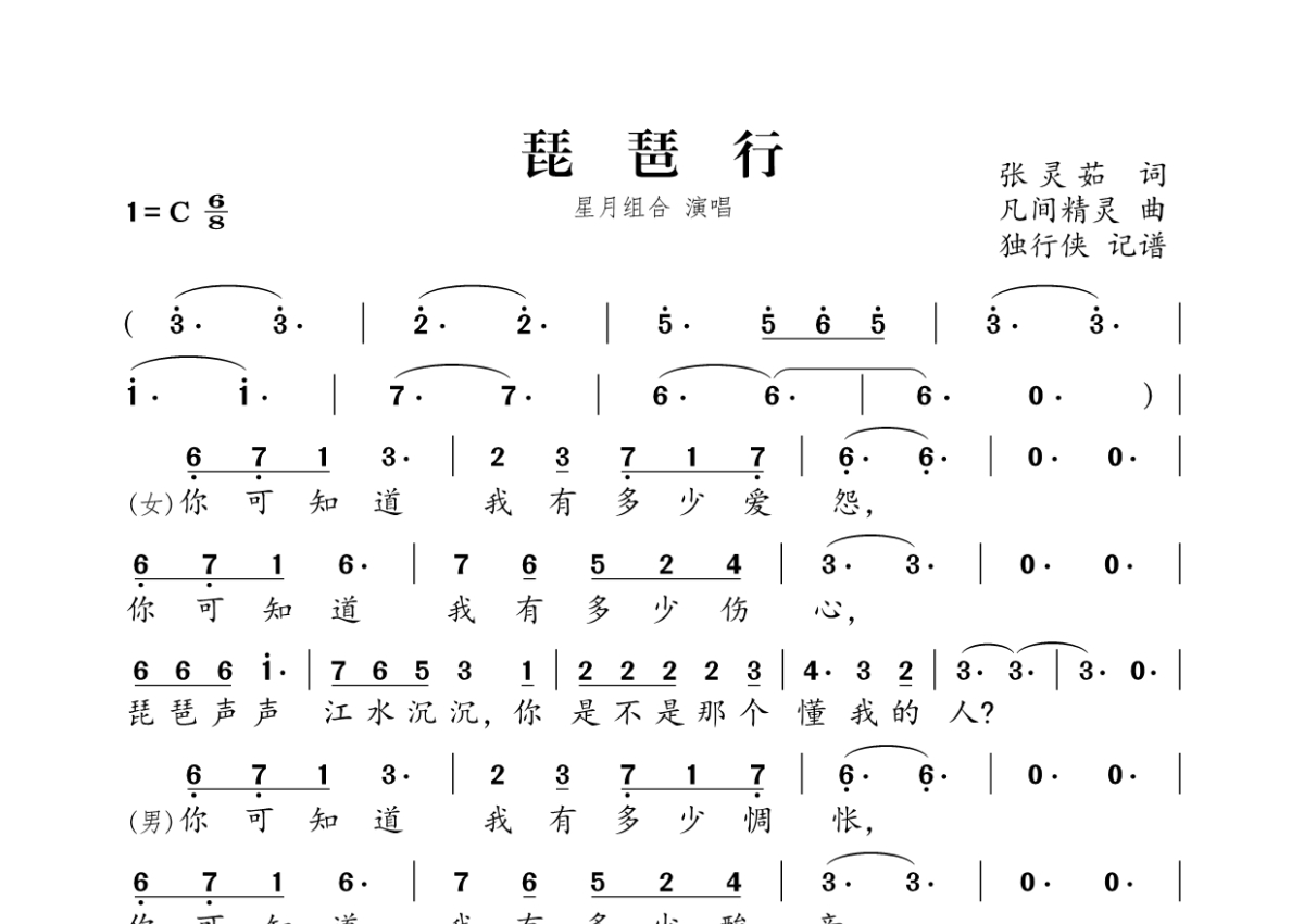 《琵琶行》是星月组合演唱的一首歌曲,拍号为6/8拍,这份简谱共有一张高清图谱,图谱由 @独行侠 编配上传。