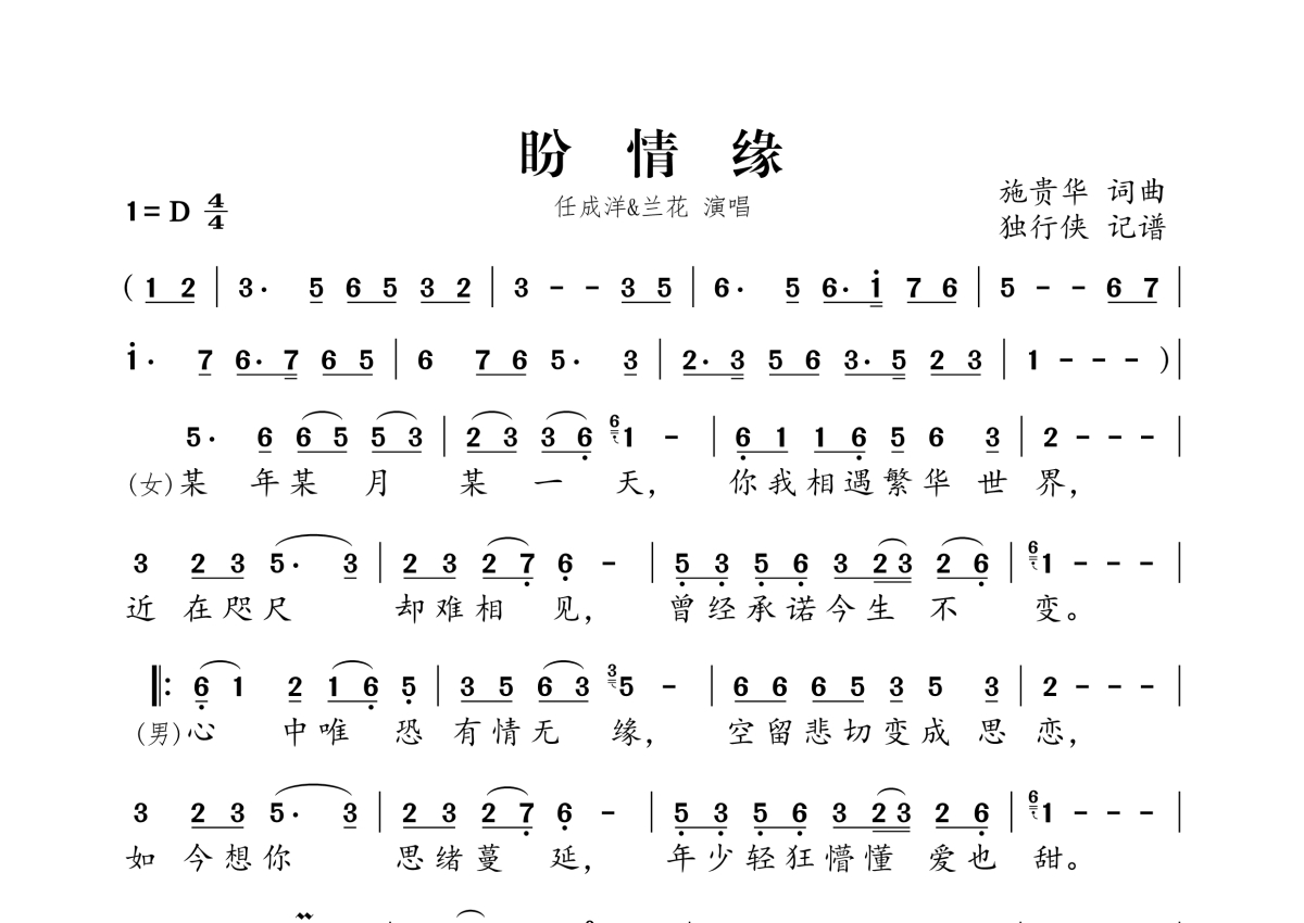 《盼情缘》是任成洋、兰花演唱的一首歌曲,拍号为4/4拍,这份简谱共有一张高清图谱,图谱由 @独行侠 编配上传。