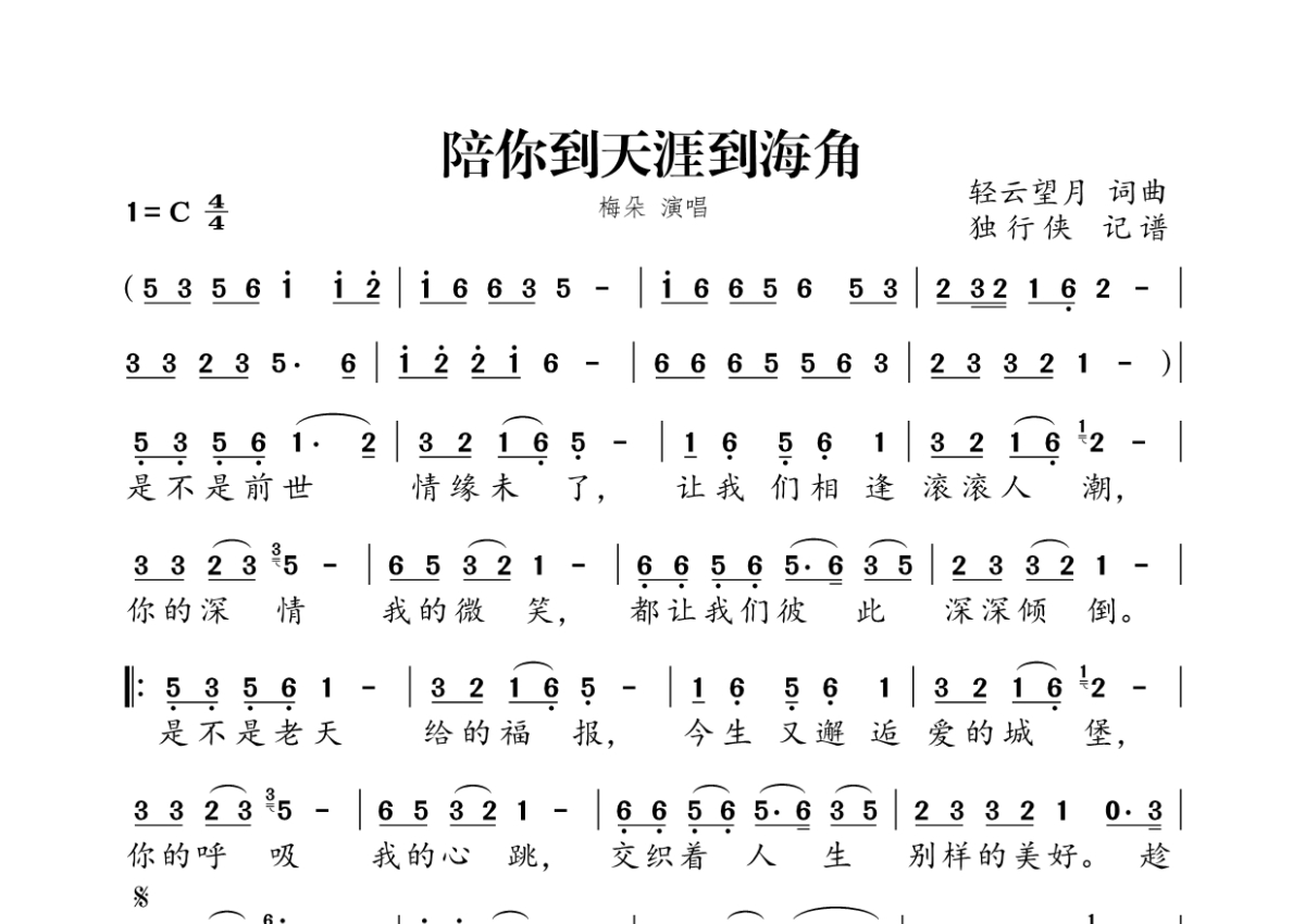 《陪你到天涯到海角》是梅朵演唱的一首歌曲,拍号为4/4拍,这份简谱共有一张高清图谱,图谱由 @独行侠 编配上传。