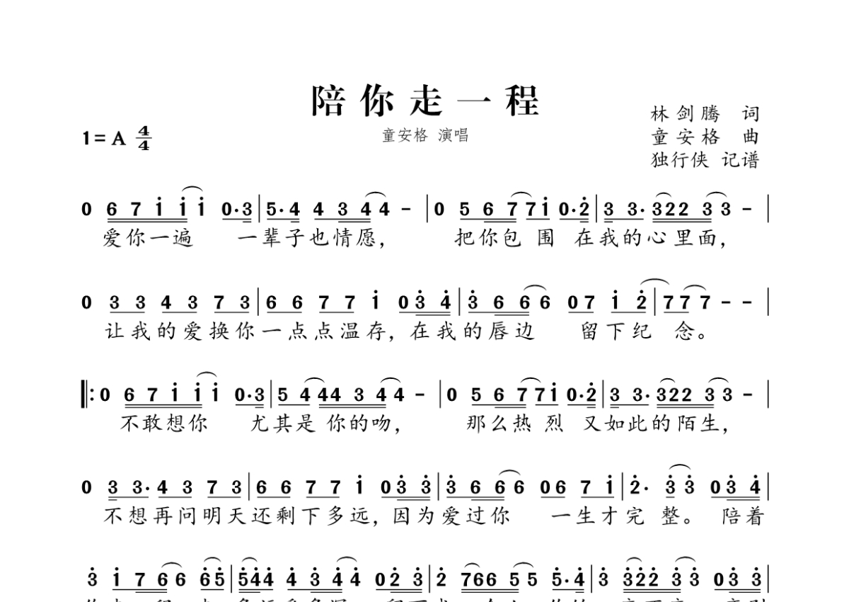 《陪你走一程》是童安格演唱的一首歌曲,拍号为4/4拍,这份简谱共有一张高清图谱,图谱由 @独行侠 编配上传。