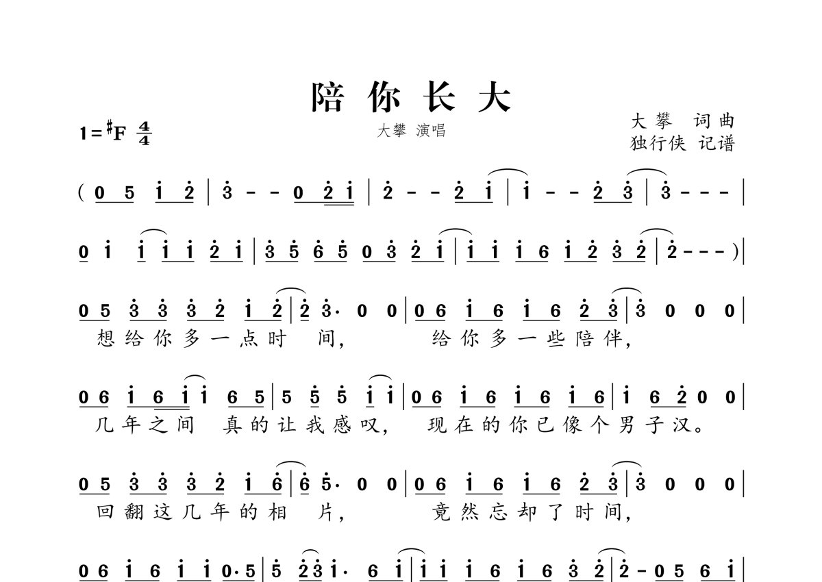 《陪你长大》是大攀演唱的一首歌曲,拍号为4/4拍,这份简谱共有两张高清图谱,图谱由 @独行侠 编配上传。