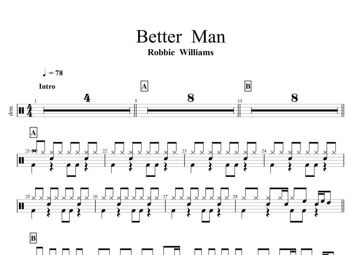 《Better Man》是Robbie Williams演唱的一首歌曲,这份鼓谱共有两张高清图谱,图谱由 @打鼓谱 编配上传,图谱使用五线谱编配,使用这份Better Man架子鼓谱,你将能够轻松地敲打出这首Robbie Williams的Better Man,快来尝试吧。《Better Man》是由爱尔兰流行男团西城男孩(Westlife)演唱的一首流行歌曲,邀请到英国唱片制作人Steve Mac和英国歌手艾德·希兰(Ed Sheeran)合作制作。歌曲发行于2019年3月29日。 。