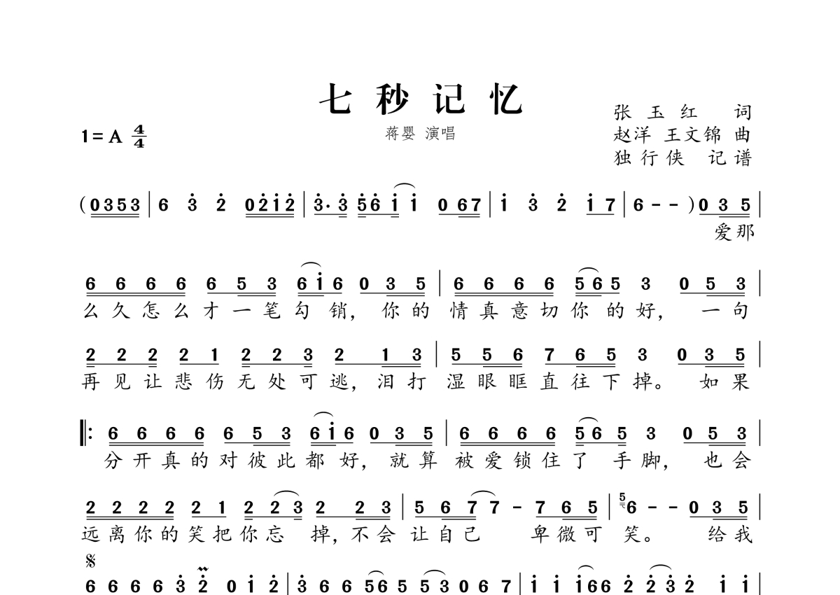 《七秒记忆》是蒋婴演唱的一首歌曲,拍号为4/4拍,这份简谱共有一张高清图谱,图谱由 @独行侠 编配上传。