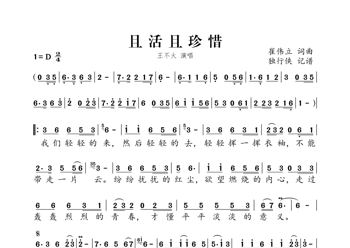 《且活且珍惜》是王不火演唱的一首歌曲,拍号为2/4拍,这份简谱共有一张高清图谱,图谱由 @独行侠 编配上传。