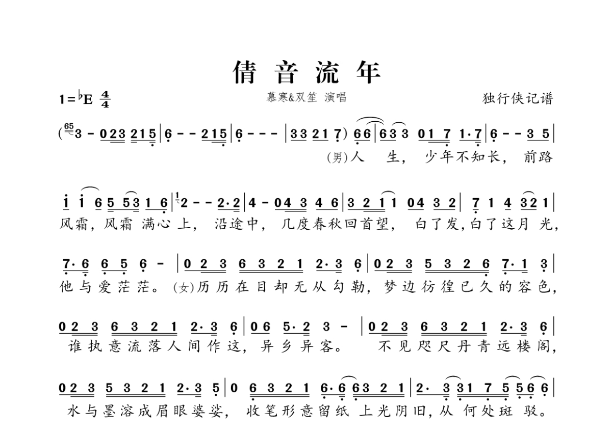 《倩音流年》是慕寒、双笙演唱的一首歌曲,拍号为4/4拍,这份简谱共有三张高清图谱,图谱由 @独行侠 编配上传。
