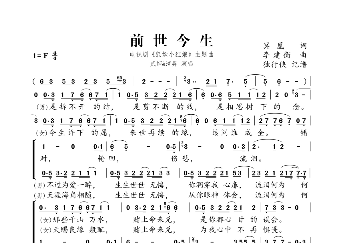 《前世今生》是贰婶、清弄演唱的一首歌曲,拍号为4/4拍,这份简谱共有一张高清图谱,图谱由 @独行侠 编配上传。