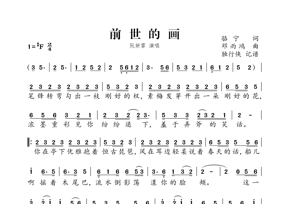 《前世的画》是阮妍霏演唱的一首歌曲,拍号为2/4拍,这份简谱共有一张高清图谱,图谱由 @独行侠 编配上传。