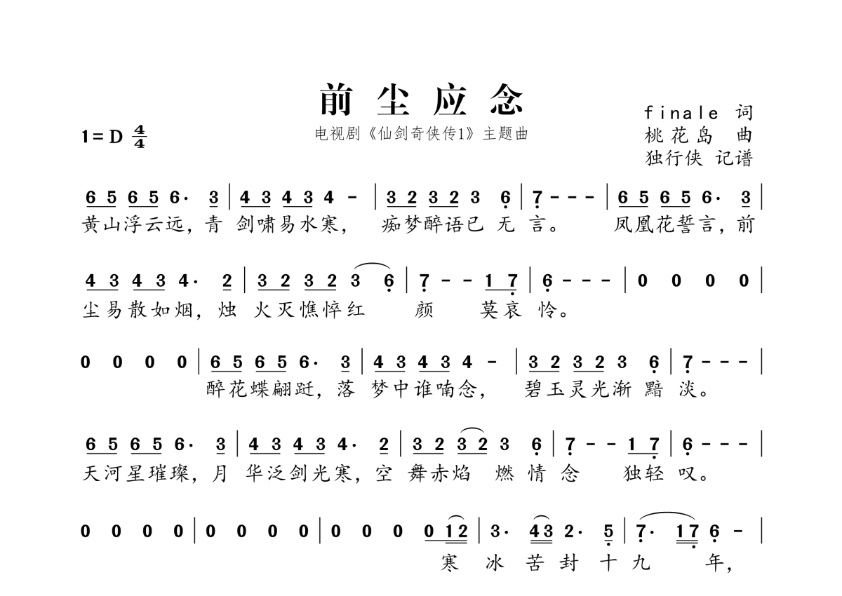 《前尘应念》,拍号为4/4拍,这份简谱共有一张高清图谱,图谱由 @独行侠 编配上传。