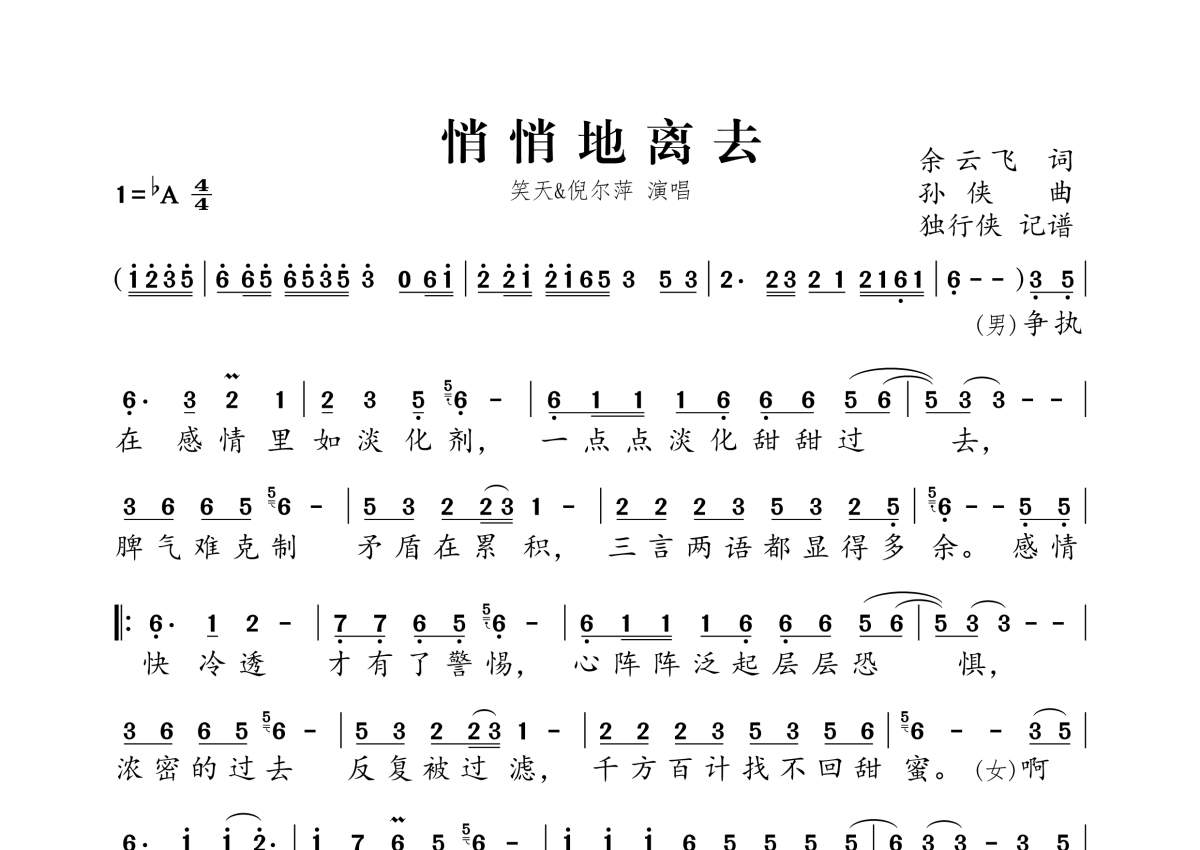笑天&倪尔萍《悄悄地离去》简谱