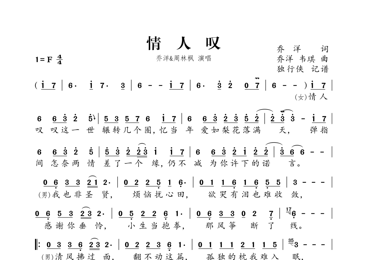 《情人叹》是乔洋&周林枫演唱的一首歌曲,拍号为4/4拍,这份简谱共有一张高清图谱,图谱由 @独行侠 编配上传。