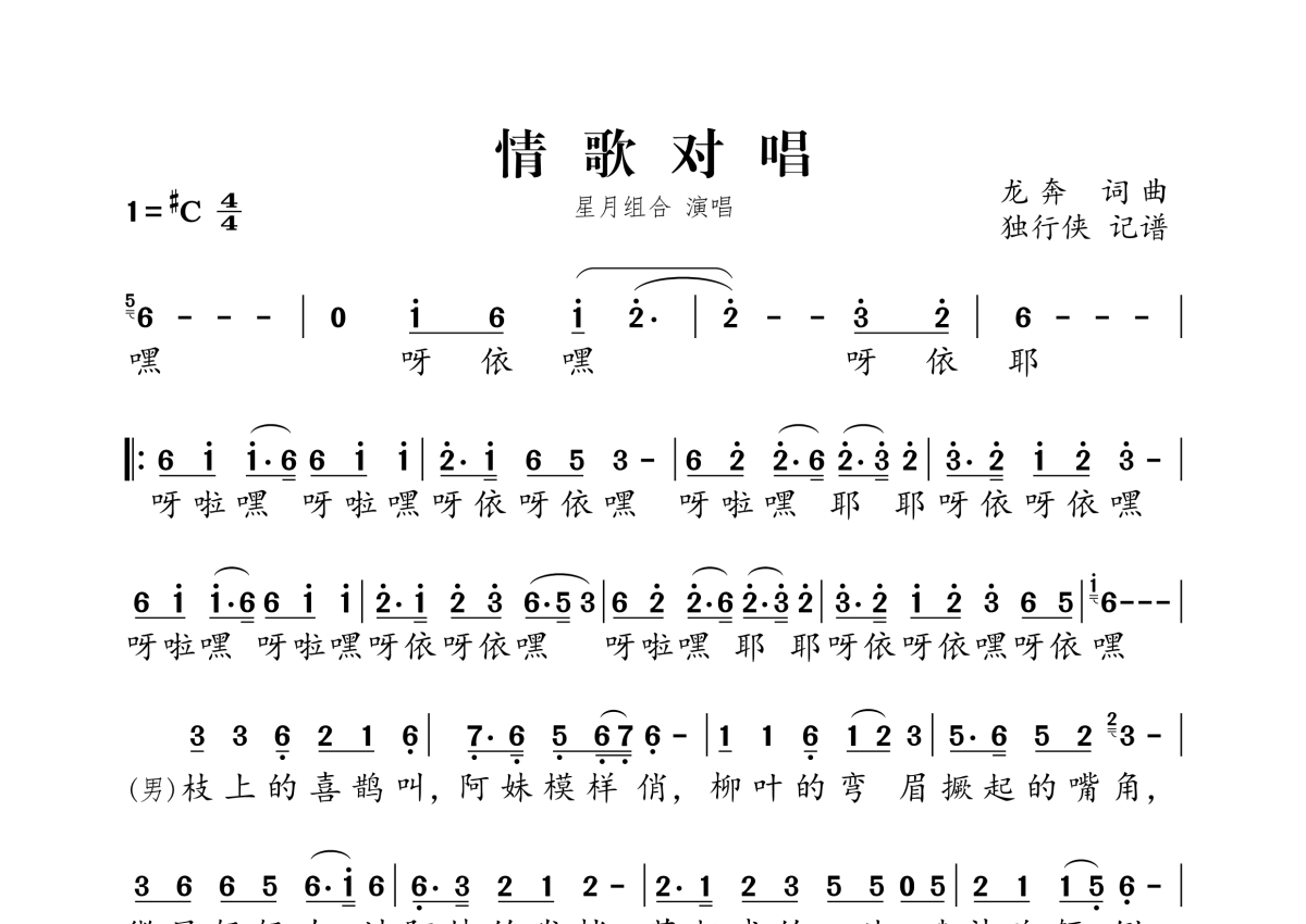 《情歌对唱》是星月组合演唱的一首歌曲,拍号为4/4拍,这份简谱共有一张高清图谱,图谱由 @独行侠 编配上传。