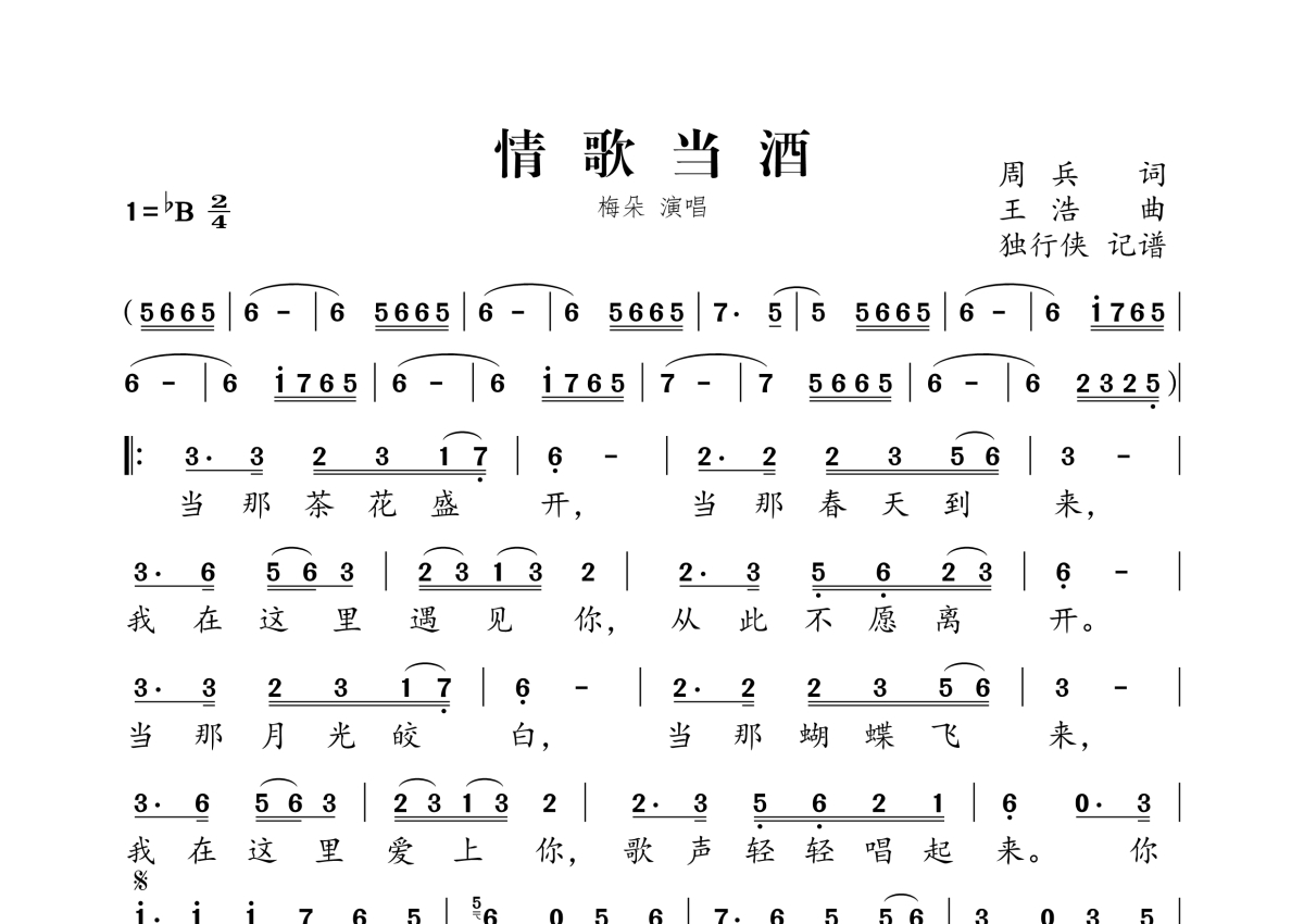 《情歌当酒》是梅朵演唱的一首歌曲,拍号为2/4拍,这份简谱共有一张高清图谱,图谱由 @独行侠 编配上传。