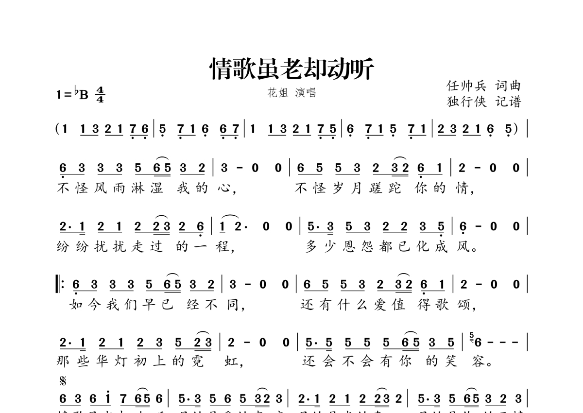 《情歌虽老却动听》是花姐演唱的一首歌曲,拍号为4/4拍,这份简谱共有一张高清图谱,图谱由 @独行侠 编配上传。
