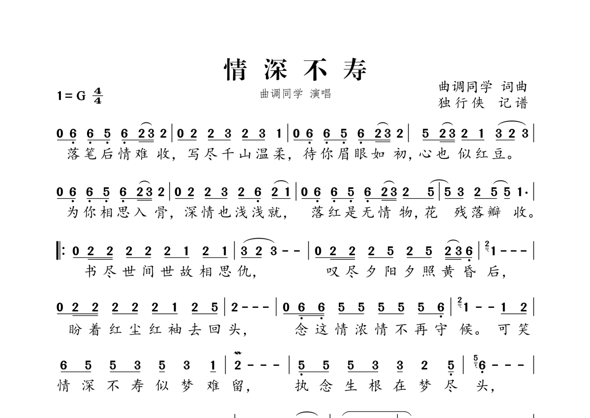 《情深不寿》是曲调同学演唱的一首歌曲,拍号为4/4拍,这份简谱共有一张高清图谱,图谱由 @独行侠 编配上传。