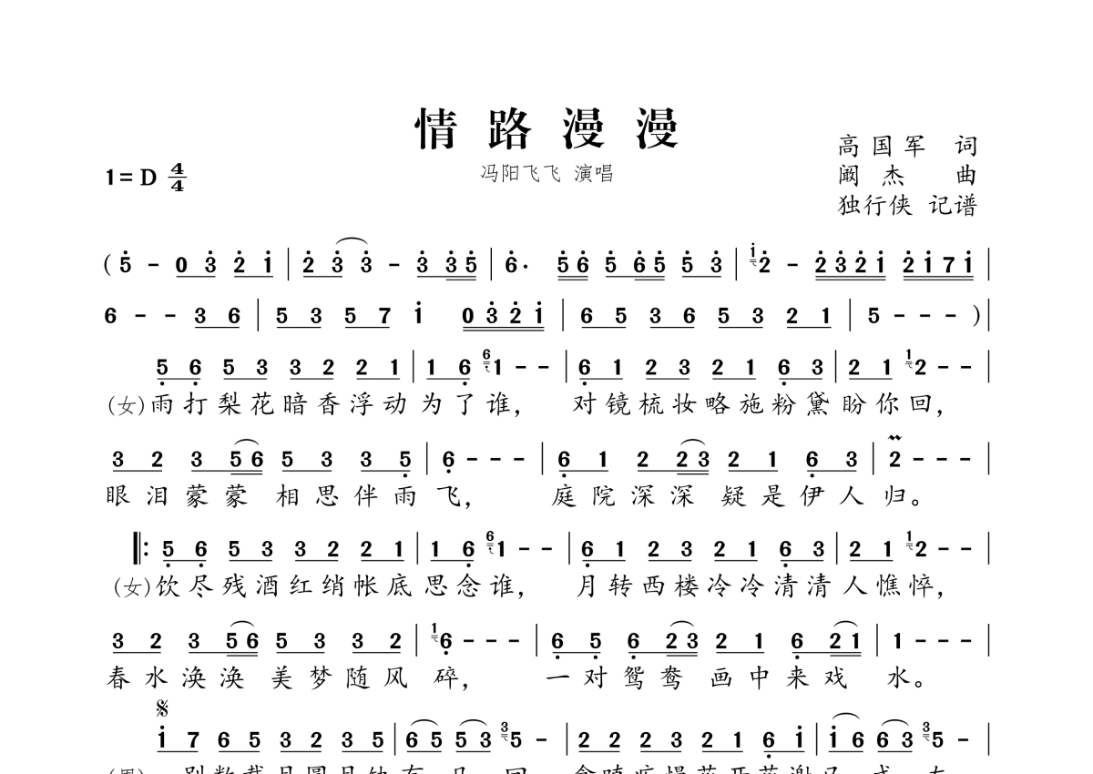 《情路漫漫》是冯阳飞飞演唱的一首歌曲,拍号为4/4拍,这份简谱共有一张高清图谱,图谱由 @独行侠 编配上传。