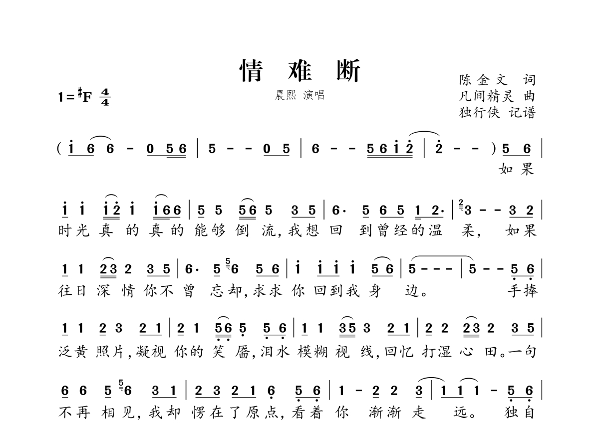 《情难断》是晨熙演唱的一首歌曲,拍号为4/4拍,这份简谱共有两张高清图谱,图谱由 @独行侠 编配上传。
