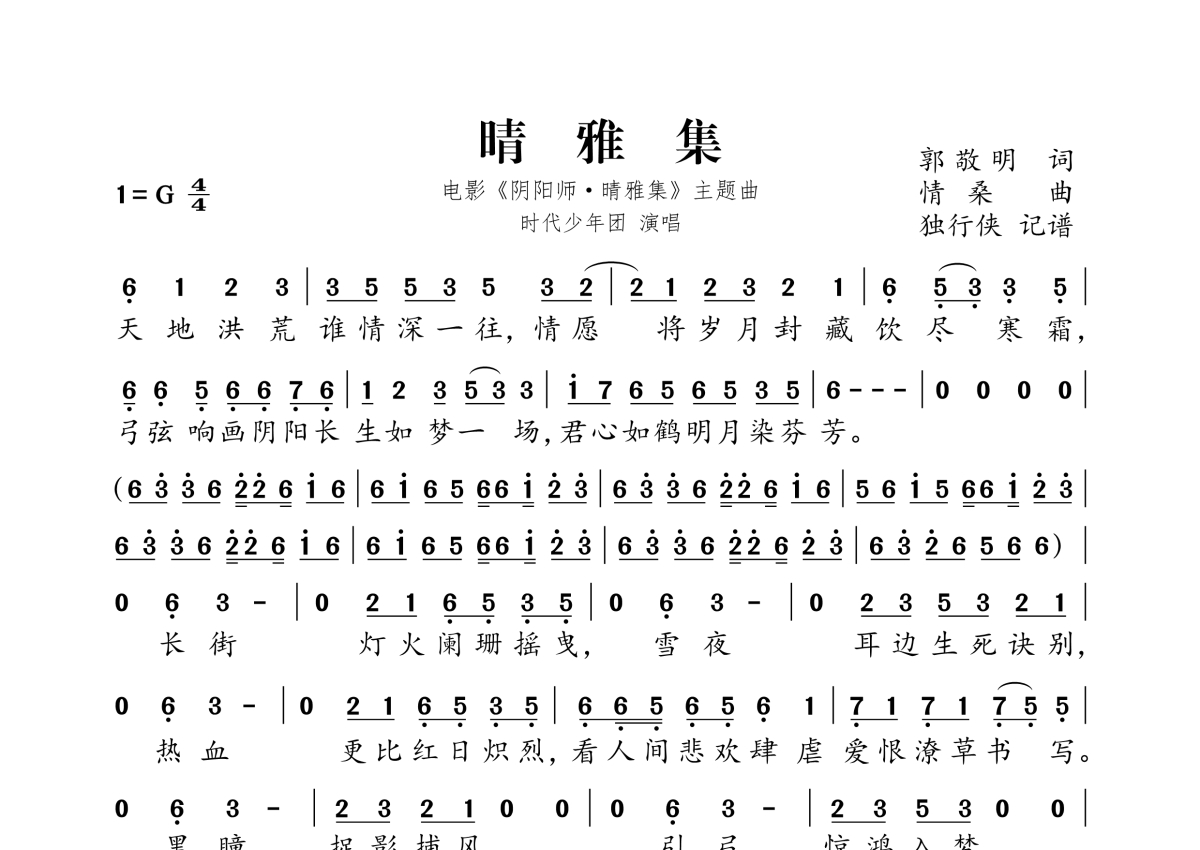 《晴雅集》是时代少年团演唱的一首歌曲,拍号为4/4拍,这份简谱共有两张高清图谱,图谱由 @独行侠 编配上传。