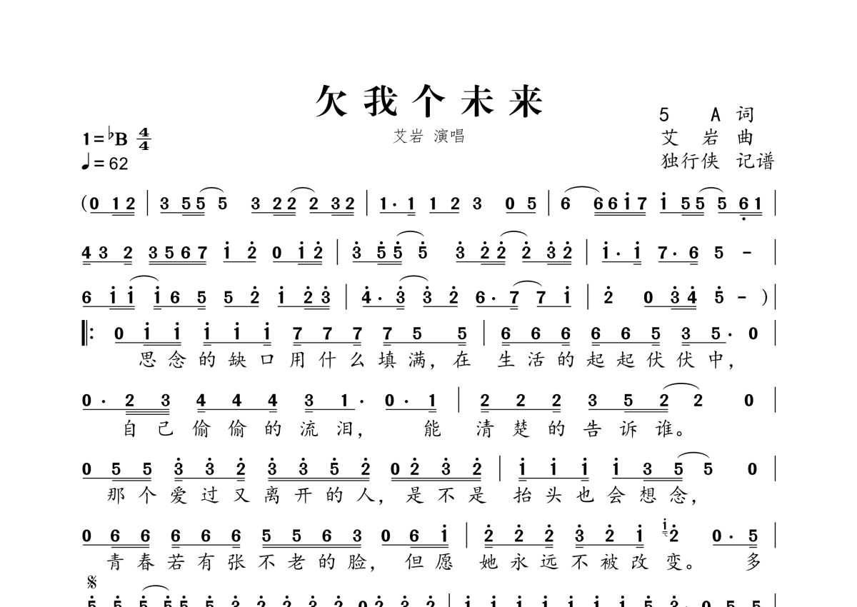 《欠我个未来》是艾岩演唱的一首歌曲,拍号为4/4拍,歌曲速度为每分钟62拍,这份简谱共有一张高清图谱,图谱由 @独行侠 编配上传。