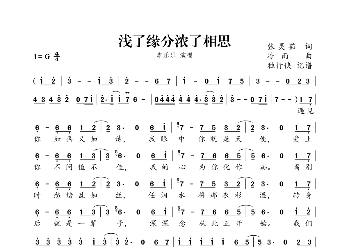 《浅了缘分浓了相思》是李乐乐演唱的一首歌曲,拍号为4/4拍,这份简谱共有一张高清图谱,图谱由 @独行侠 编配上传。