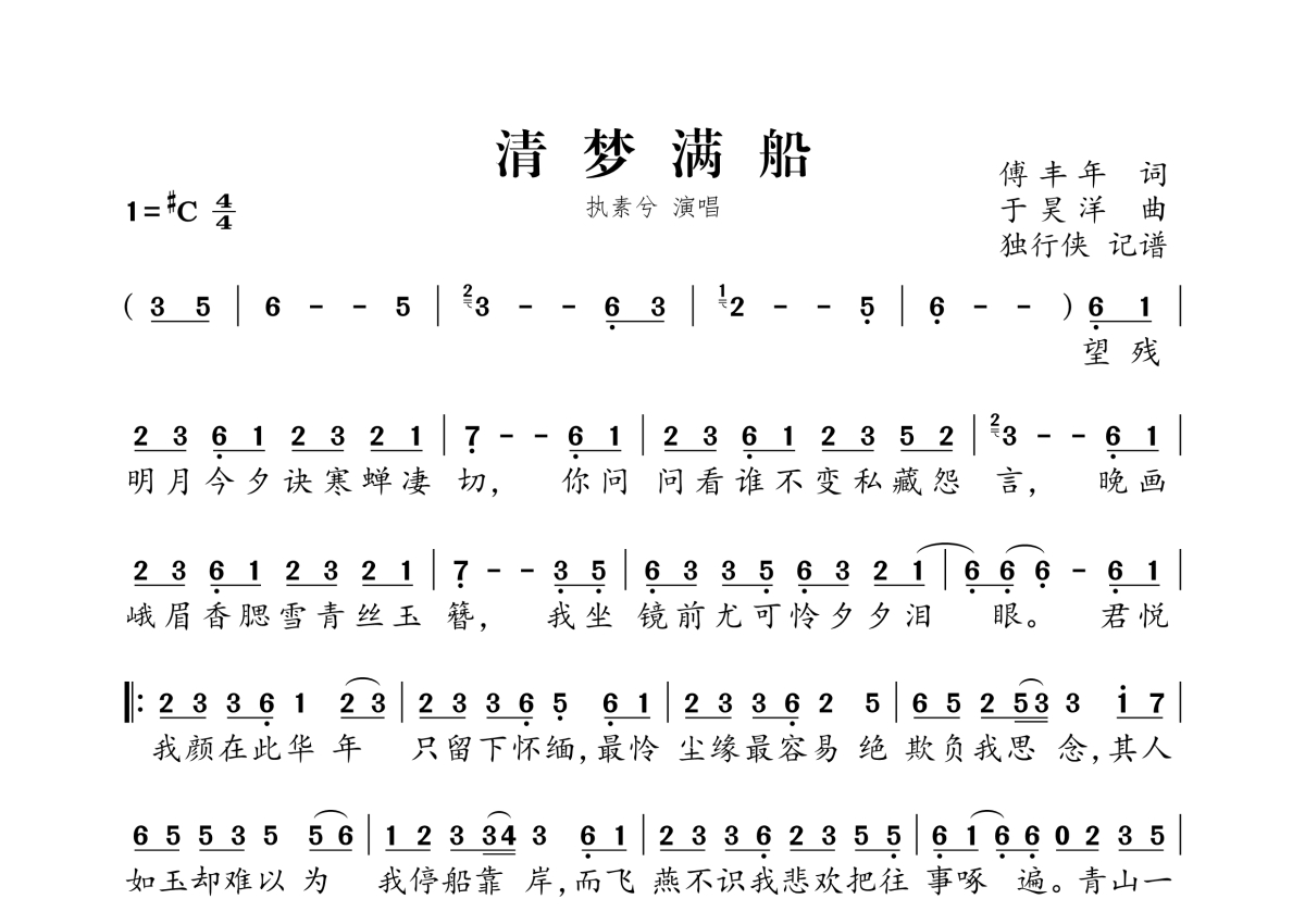 《清梦满船》是执素兮演唱的一首歌曲,拍号为4/4拍,这份简谱共有一张高清图谱,图谱由 @独行侠 编配上传。
