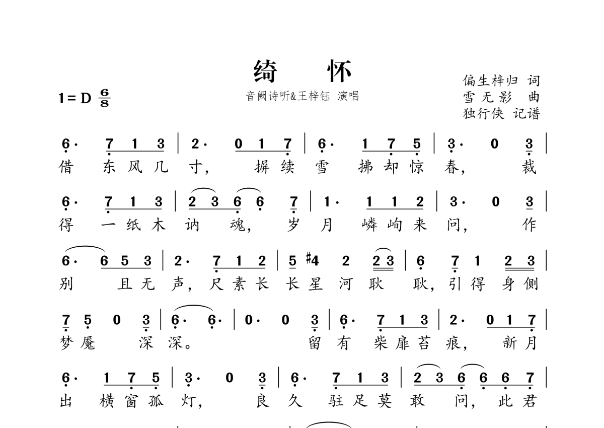 《绮怀》是音阙诗听&王梓钰演唱的一首歌曲,拍号为6/8拍,这份简谱共有一张高清图谱,图谱由 @独行侠 编配上传。