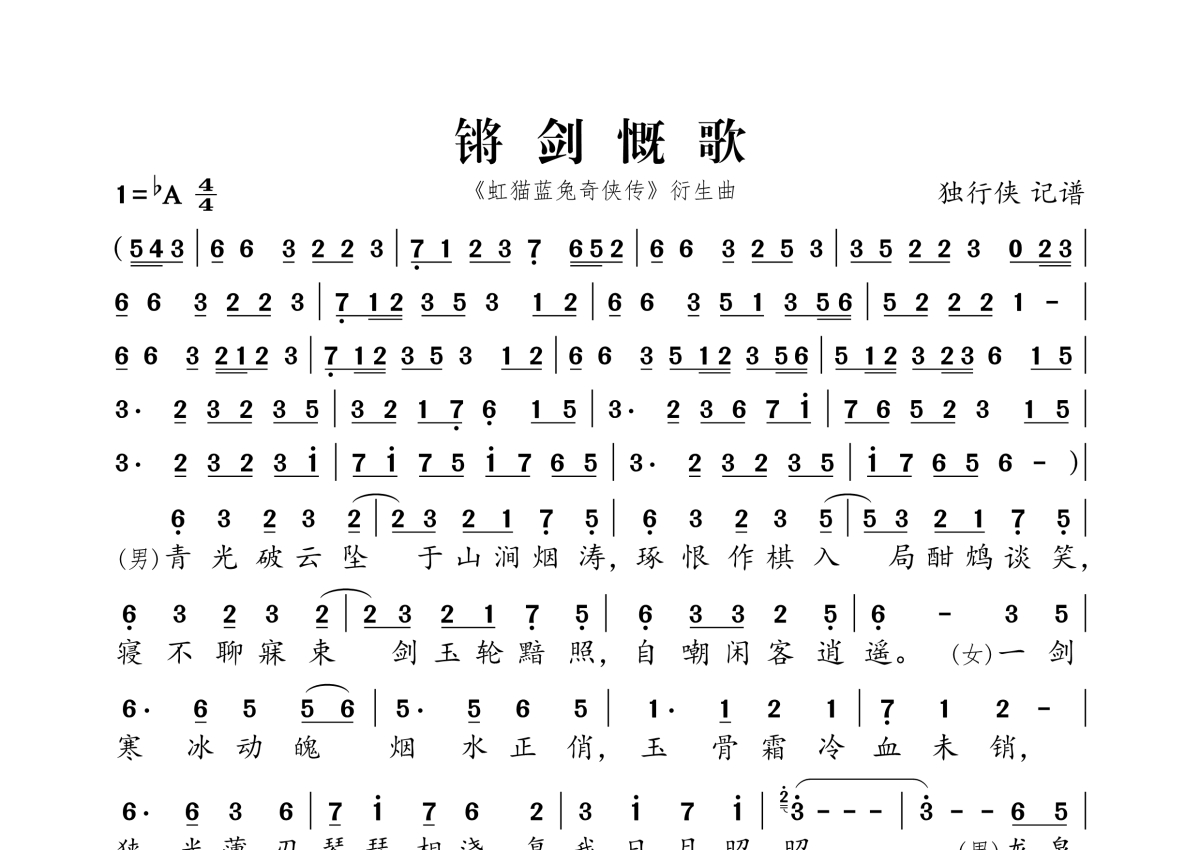 《锵剑慨歌》,拍号为4/4拍,这份简谱共有两张高清图谱,图谱由 @独行侠 编配上传。