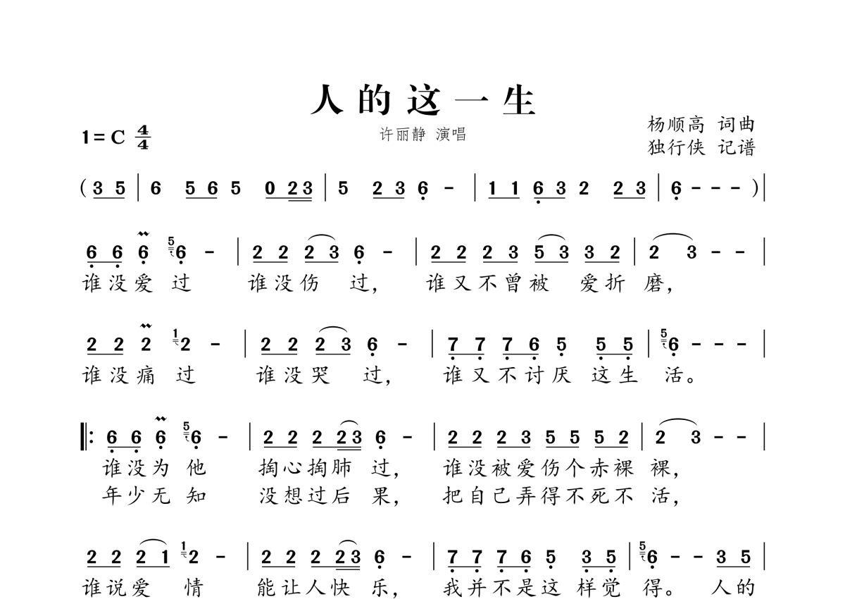 《人的这一生》是许丽静演唱的一首歌曲,拍号为4/4拍,这份简谱共有一张高清图谱,图谱由 @独行侠 编配上传。
