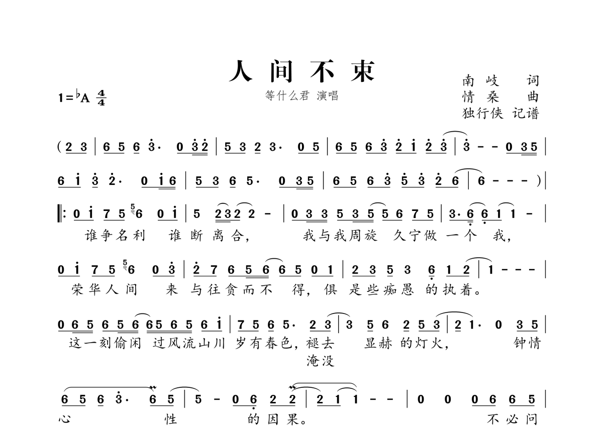 《人间不束》是邓寓君(等什么君)演唱的一首歌曲,拍号为4/4拍,这份简谱共有一张高清图谱,图谱由 @独行侠 编配上传。