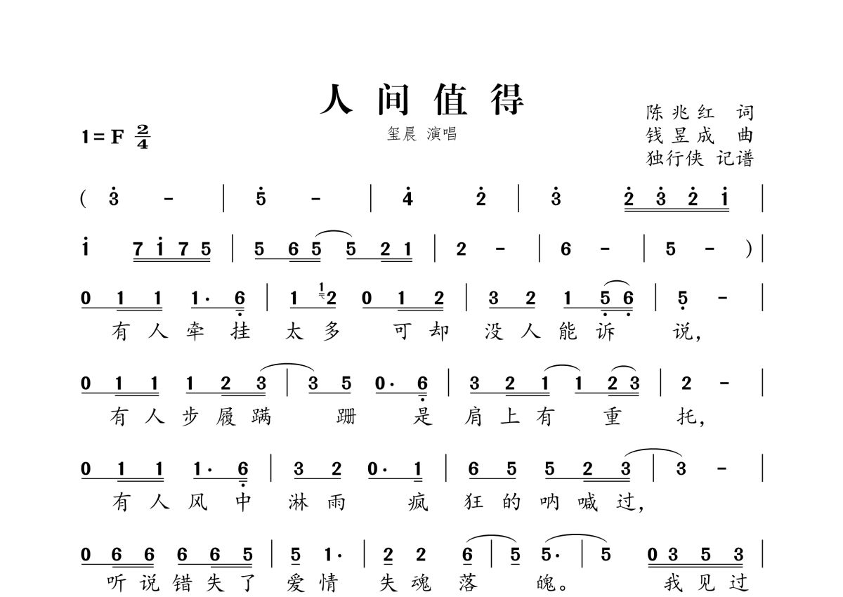 《人间值得》是玺晨演唱的一首歌曲,拍号为2/4拍,这份简谱共有两张高清图谱,图谱由 @独行侠 编配上传。