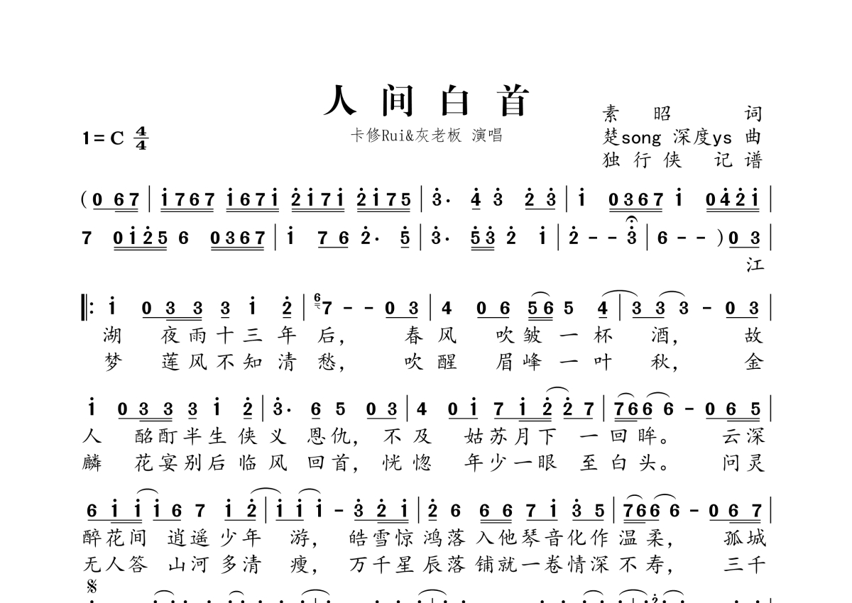 《人间白首》是卡修Rui&灰老板演唱的一首歌曲,拍号为4/4拍,这份简谱共有一张高清图谱,图谱由 @独行侠 编配上传。