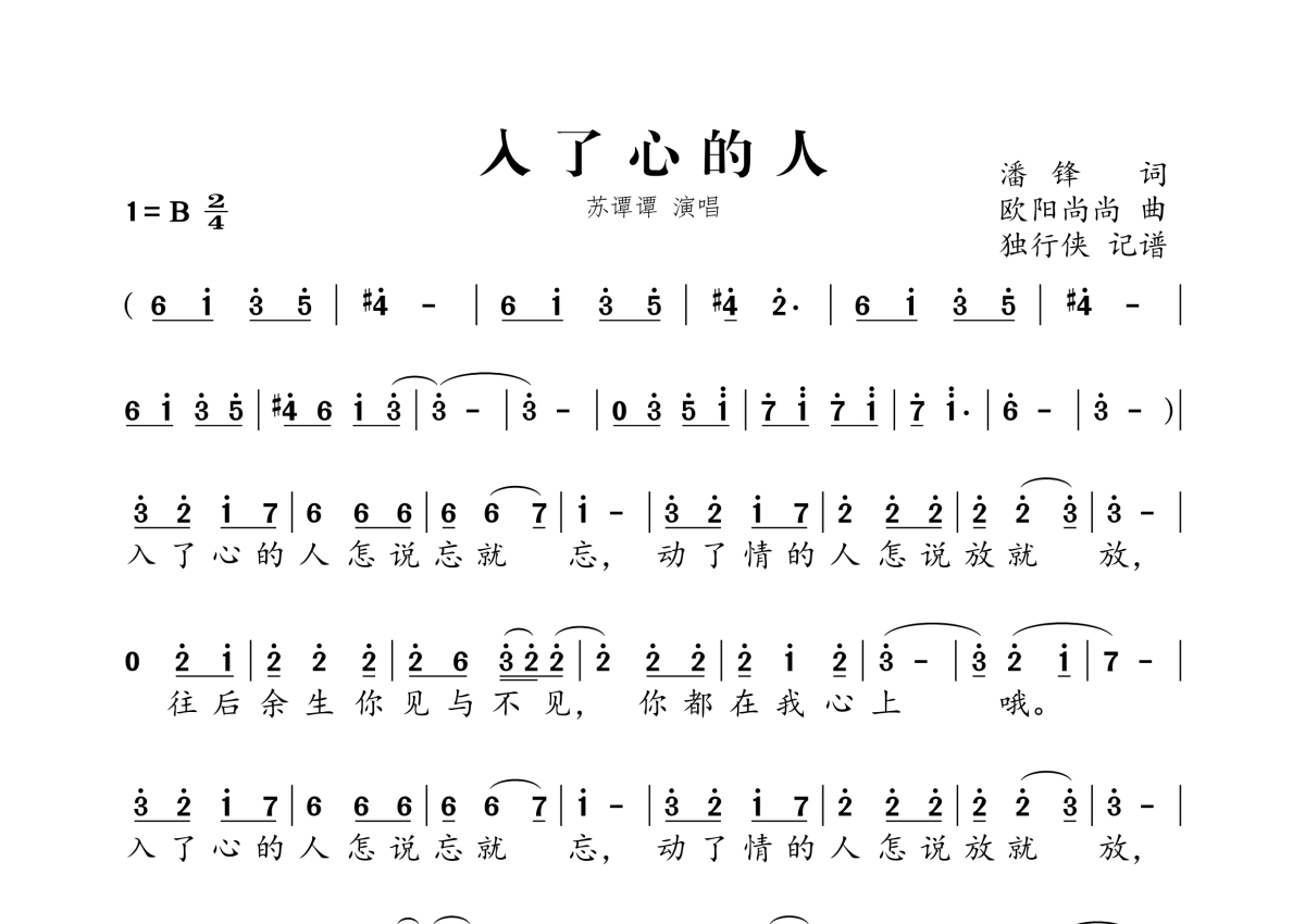 《入了心的人》是苏谭谭演唱的一首歌曲,拍号为2/4拍,这份简谱共有两张高清图谱,图谱由 @独行侠 编配上传。