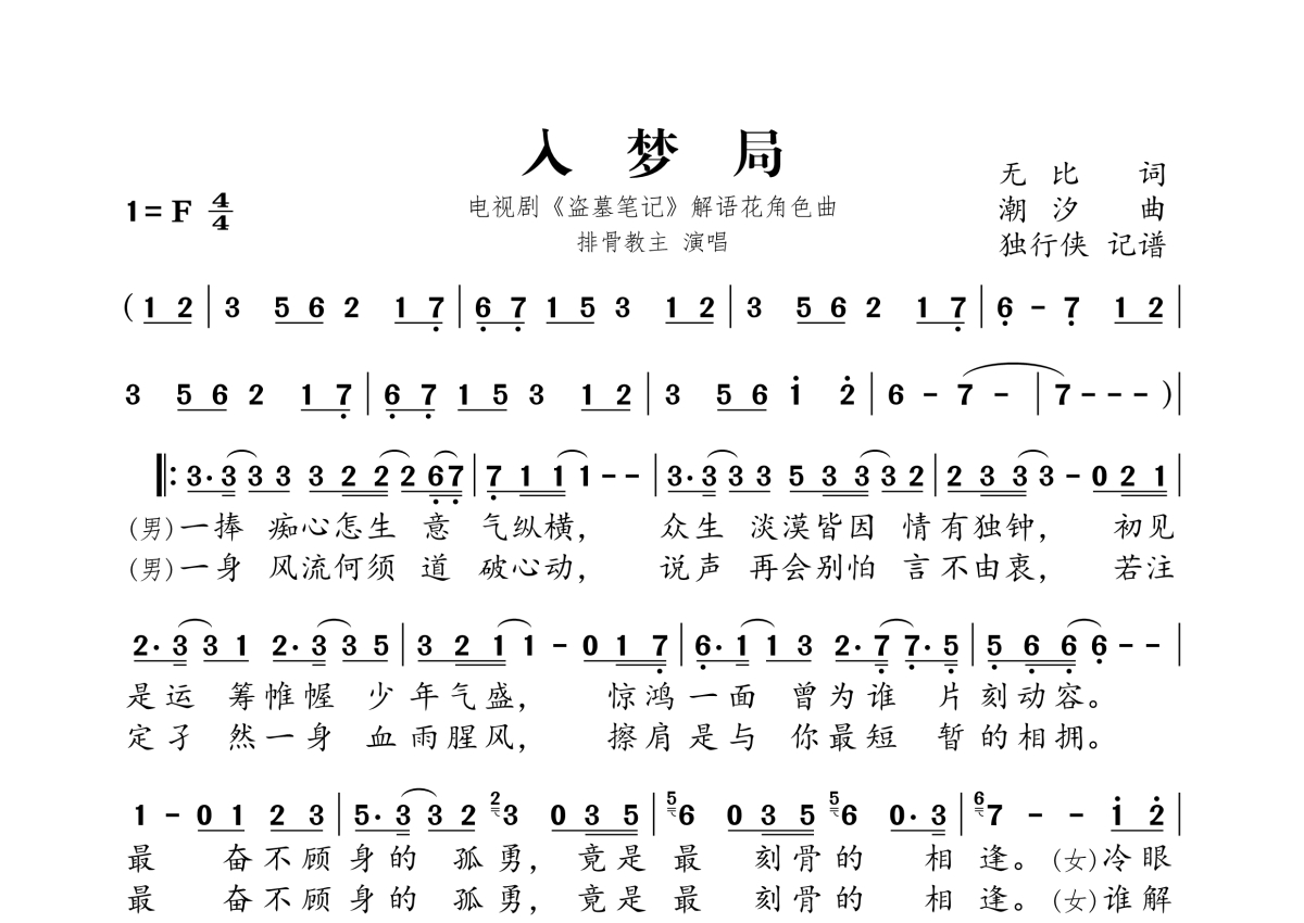 《入梦局》是排骨教主演唱的一首歌曲,拍号为4/4拍,这份简谱共有两张高清图谱,图谱由 @独行侠 编配上传。