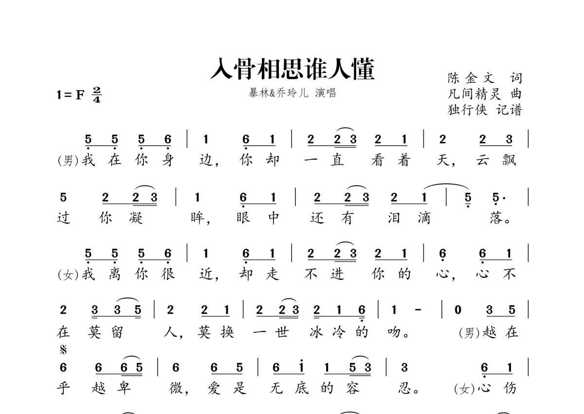 《入骨相思谁人懂》是暴林&乔玲儿演唱的一首歌曲,拍号为2/4拍,这份简谱共有一张高清图谱,图谱由 @独行侠 编配上传。