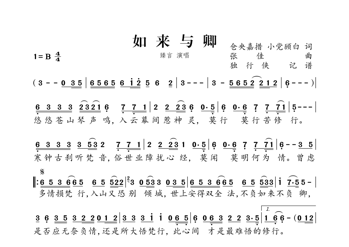 《如来与卿》是臻言演唱的一首歌曲,拍号为4/4拍,这份简谱共有一张高清图谱,图谱由 @独行侠 编配上传。