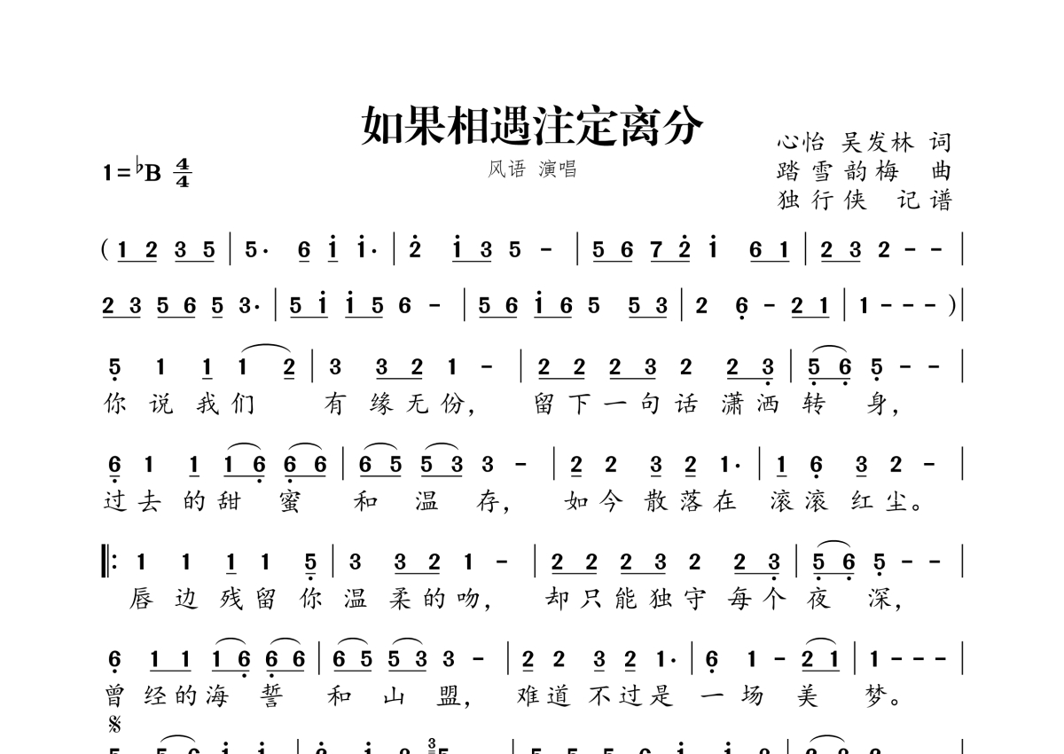 《如果相遇注定离分》是风语演唱的一首歌曲,拍号为4/4拍,这份简谱共有一张高清图谱,图谱由 @独行侠 编配上传。