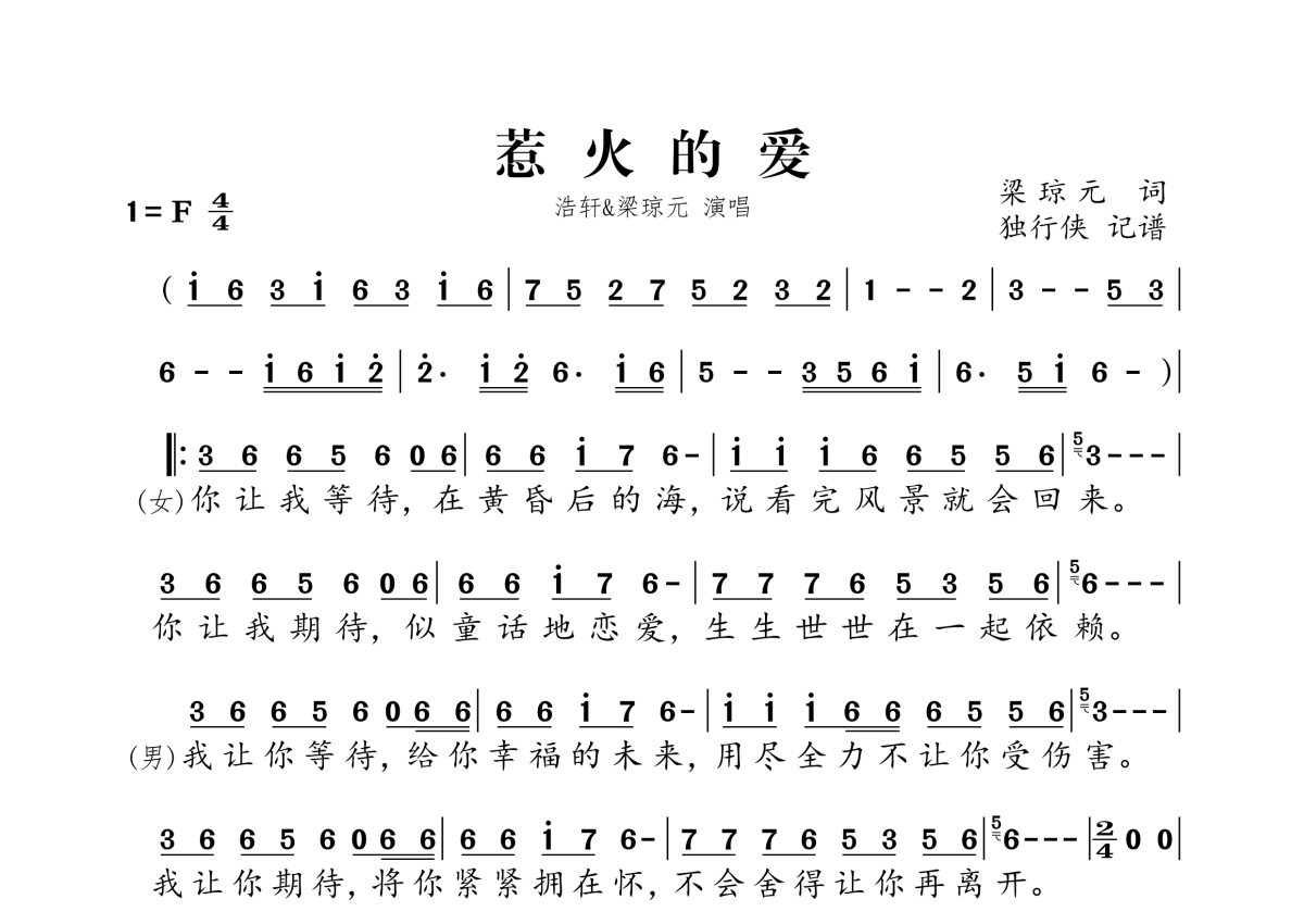 《惹火的爱》是浩轩&梁琼元演唱的一首歌曲,拍号为4/4拍,这份简谱共有两张高清图谱,图谱由 @独行侠 编配上传。