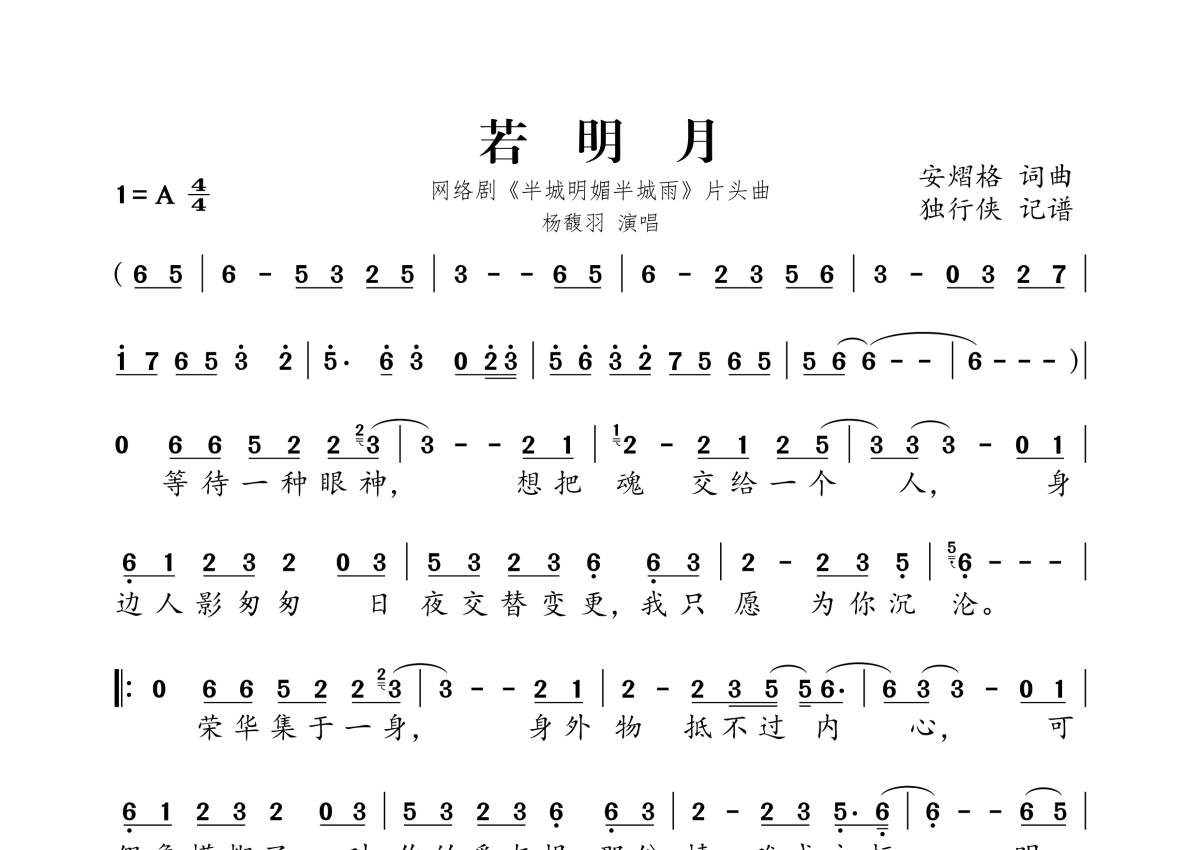 《若明月》是杨馥羽演唱的一首歌曲,拍号为4/4拍,这份简谱共有一张高清图谱,图谱由 @独行侠 编配上传。