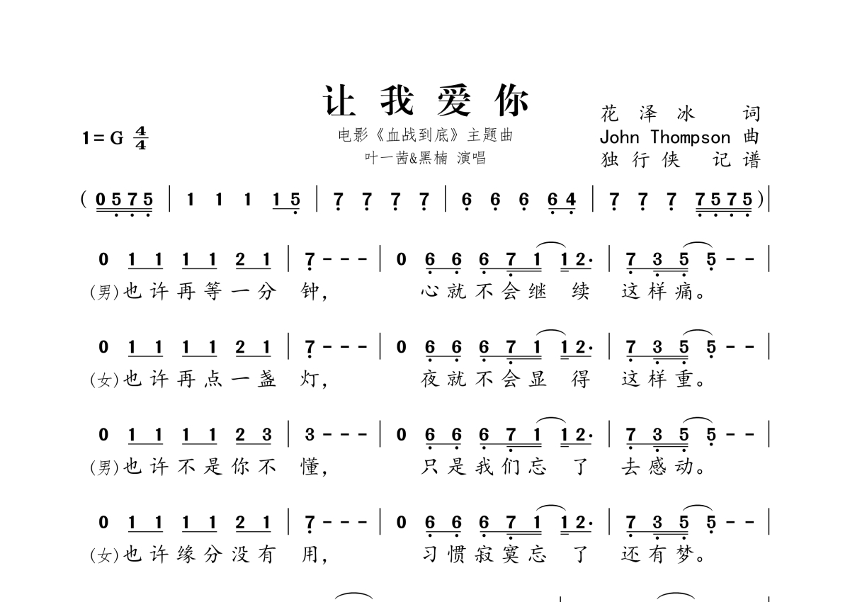 《让我爱你》是叶一茜、黑楠演唱的一首歌曲,拍号为4/4拍,这份简谱共有一张高清图谱,图谱由 @独行侠 编配上传。