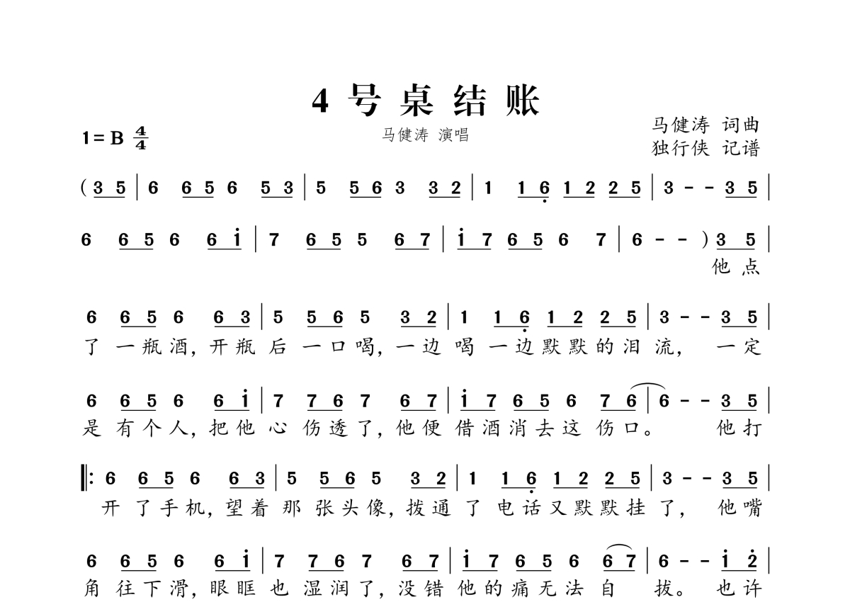 《4号桌结账》是马健涛演唱的一首歌曲,拍号为4/4拍,这份简谱共有一张高清图谱,图谱由 @独行侠 编配上传。